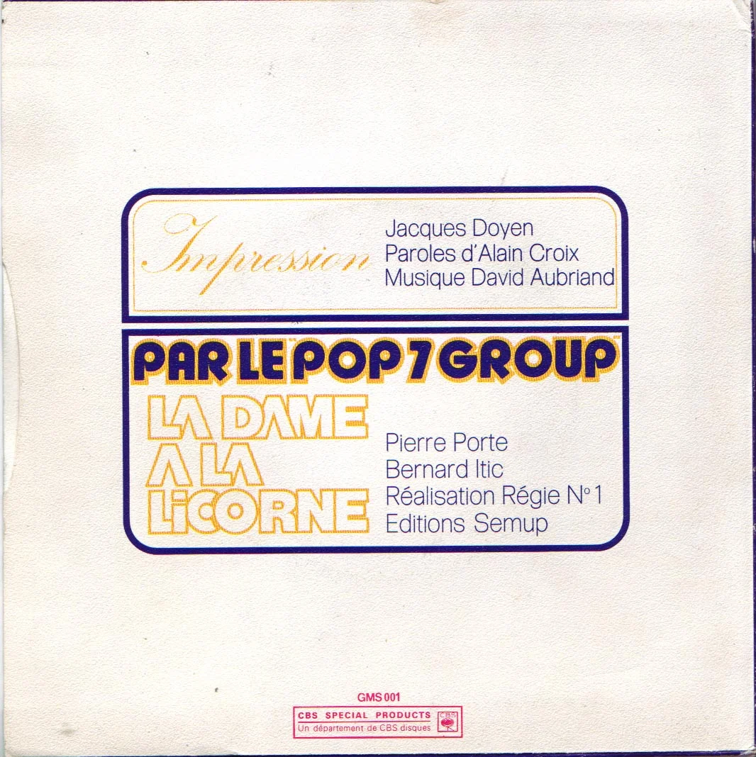 Face ALa dame a la licornepar le "POP 7 GROUP"(Pierre Porte — Bernard Itic)Face BImpression(Jaques Doyen — paroles d' Alain Croixmusique de David Aubriand)Enjoy !
